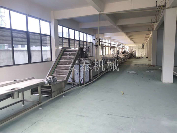 薯片工藝流程:土豆浸泡機 —— 上料提升機—— 清洗去皮機 —— 挑揀線 —— 提升機 —— 切片機 —— 漂洗線 —— 風冷瀝水機 —— 油炸線 —— 振動瀝油機 —— 調味拌料機—— 稱重包裝機